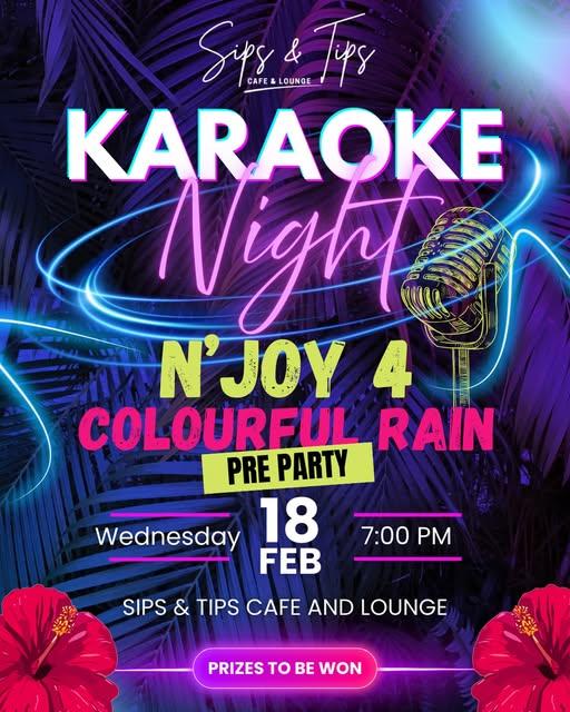 Event February 18, 2026, 12:00 am-February 19, 2026, 12:00 am Karaoke Night: N’Joy 4 Colourful Rain Pre-Party at Sips & Tips Karaoke Night: N’Joy 4 Colourful Rain Pre-Party at Sips & Tips Favorite Karaoke Night: N’Joy 4 Colourful Rain Pre-Party at Sips & Tips No Reviews Music Gigs Join us for Karaoke Night: N’Joy 4 Colourful Rain Pre-Party at Sips & Tips Sing Read more... 556F+97V