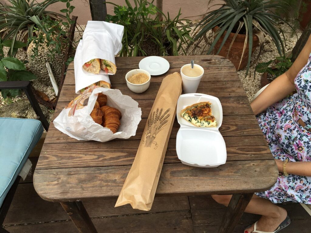 The menu centers on French-style baked goods, sandwiches, and quiches. Verified offerings include: