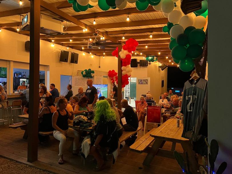Guests can enjoy a relaxed meal during the day or join the vibrant nightlife scene in the evening, with music, games, and a welcoming community vibe. The cuisine is Caribbean‑inspired, complemented by bar favorites and hearty comfort dishes, making it suitable for both daytime dining and evening entertainment.