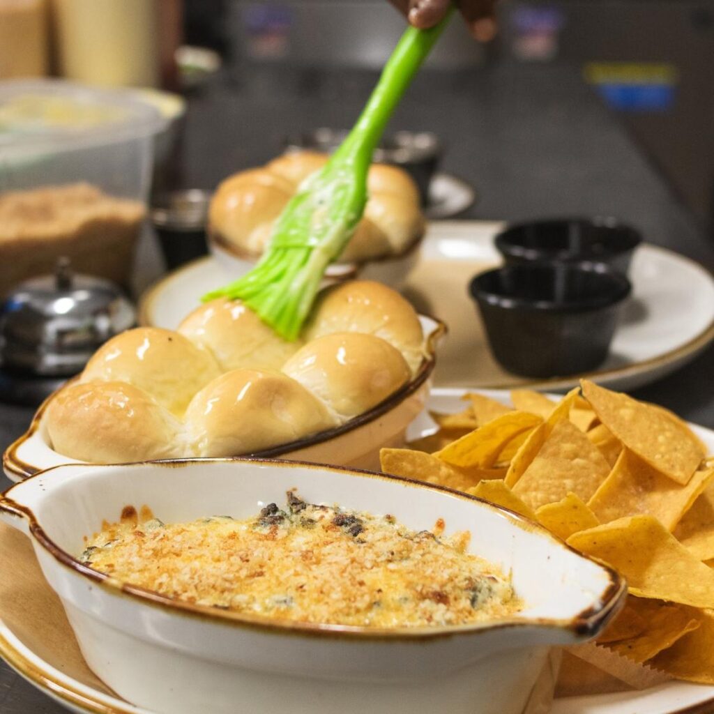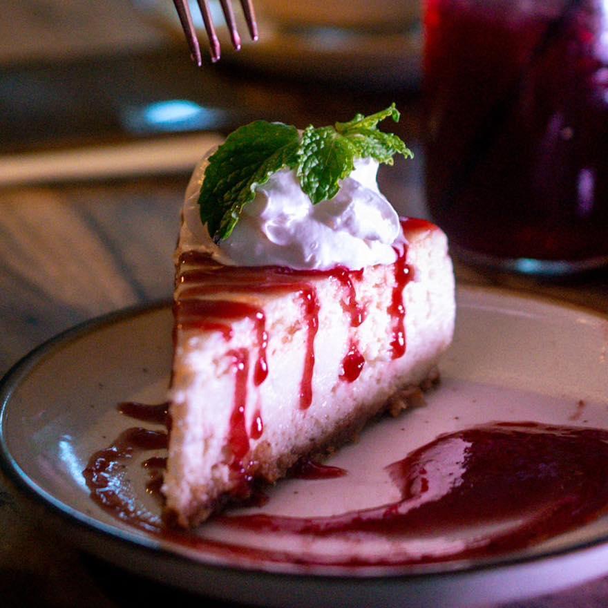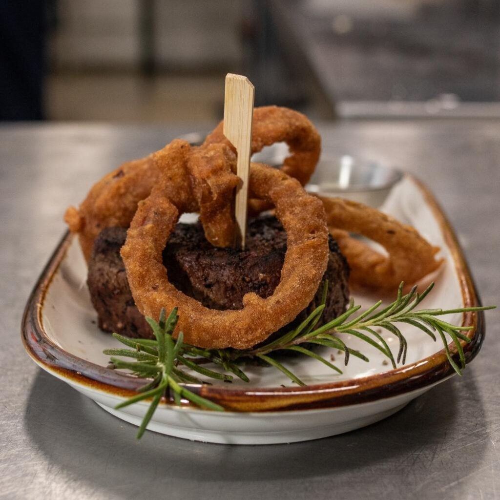 The menu features a range of steaks in various cuts and sizes, alongside sides like mac and cheese, Caesar salad, and jalapeño poppers. Non-steak options include catch-of-the-day fish and chicken dishes. Desserts are limited but include items like a multi-layer chocolate cake. Gather Steakhouse is open for dinner only: