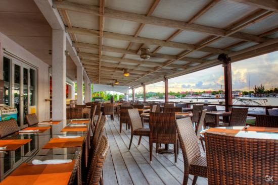 Al Porto is an Italian restaurant located on the waterfront in Jolly Harbour. It offers a stylish contemporary setting with a large deck providing a constant sea breeze. The menu features authentic Italian dishes, including pizzas from a brick domed oven, homemade pasta, and other mains like grilled lobster and fresh fish. Popular dishes include various pizzas and pasta options.