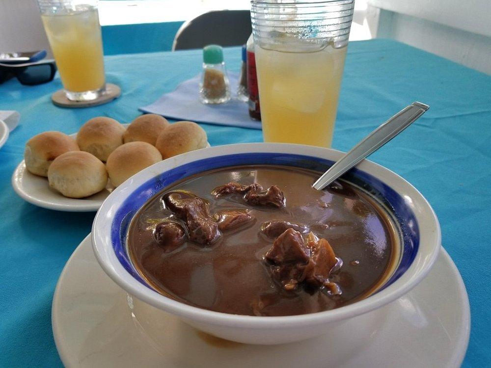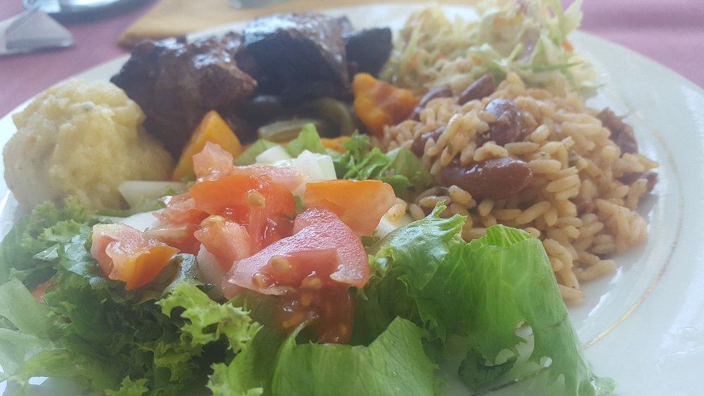 Vegetarian and vegan options are available, including vegetable roti and fresh juices. The menu emphasizes freshly prepared meals with Caribbean flavors, complemented by simple international comfort dishes. Drinks include ginger beer, fruit juices, and local beers, making the dining experience complete.